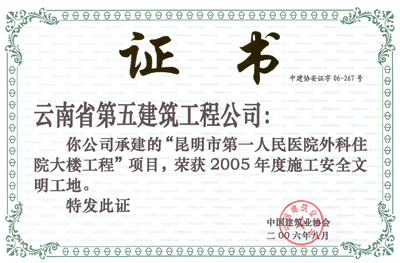 昆明市第一人民醫(yī)院外科住院大樓—2005年度“AAA級(jí)安全文明標(biāo)準(zhǔn)化誠信工地”
